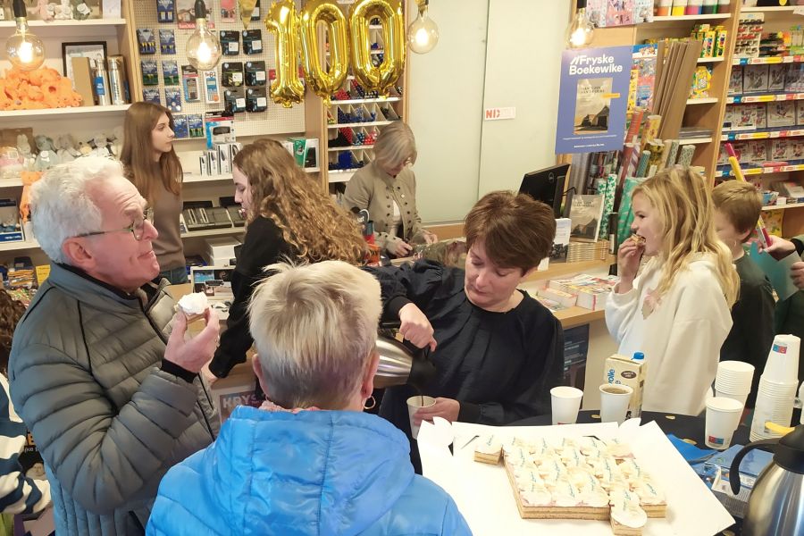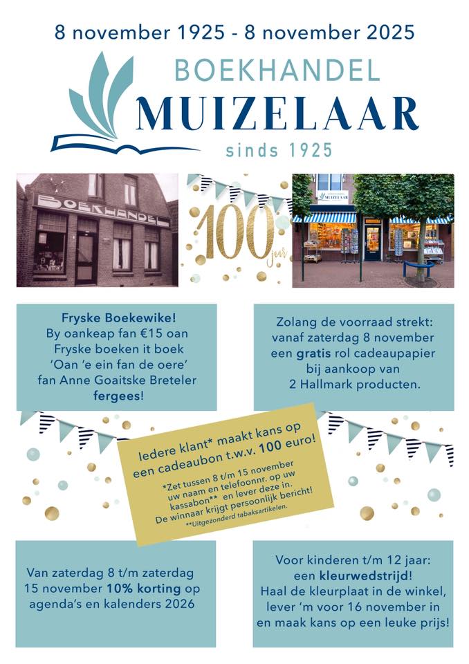Vandaag, 8 november 2025 bestaat Boekhandel Muizelaar in Koudum precies 100 jaar! Het was deze ochtend dan ook druk op nummer 11 in de Hoofdstraat. De etalages waren speciaal ingericht en de winkel was feestelijk versierd. Er stond koffie met een lekker stukje oranjekoek klaar voor de talloze klanten die met cadeautjes kwamen om Jantje Muizelaar te feliciteren. Omrop Fryslân kwam langs en interviewde de jubilaris, de derde generatie Muizelaar die de boekhandel in Koudum runt.
