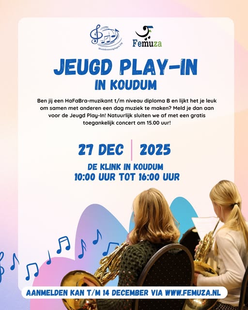 Voor alle HaFaBra-muzikanten t/m diploma B die het leuk vinden om een dag samen te spelen met andere jonge muzikanten: meld je aan voor de Jeugd Play-In op zaterdag 27 december 2025 in De Klink in Koudum. Onder leiding van Jeanette Valkema en Christina van der Bijl werken de muzikanten van 10.00 tot 15.00 uur aan een vrolijk en afwisselend muziekprogramma. Om 15.00 uur is er vervolgens een eindconcert waarbij iedereen – gratis! – welkom is. Aanmelden kan tot en met 14 december, zie hieronder.