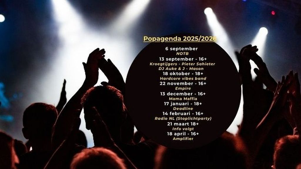 De volgende popavonden zijn in 2025 op 18 oktober (18+ Hardcore Vibes Band), 22 november (16 + Empire), 13 december (16+ Mama Maffia). In 2026 zijn de data: op 17 januari (18+ Deadline), 14 februari (16+ Radio NL, stoplichtparty), op 21 maart (18+ nog niet bekend) en als laatste van dit seizoen 18 april (16+ Amplifier).